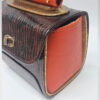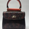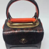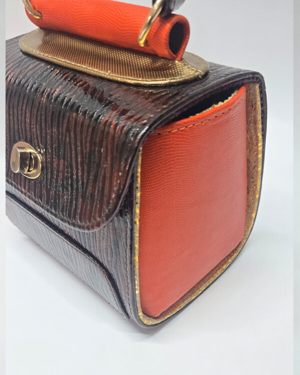 This Petite-Midi silhouette features a dual-texture leather finish: a dark, glossed grain leather front and body with textured tangerine leather side panels and a coordinating handle spine. The saddle handle is detailed in deep brown, offset with gold-tone rings and a matte bronze leather plate at the base.