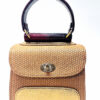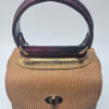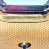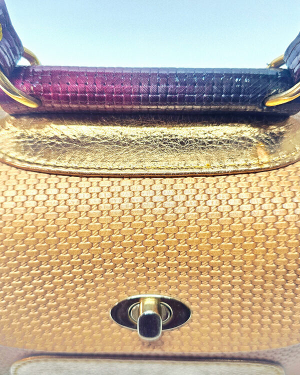This Petite-Midi handbag is crafted in a textured tan-basket weave leather with a bold metallic gold front panel and smooth metallic gold sides. The handle features a shimmering gradient finish in plum-to-black tones, framed by a glossy dark trim. The upper base is finished in soft gold leather, balancing subtle shine with structure.
